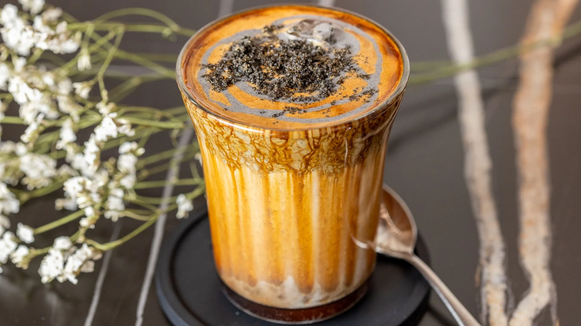 A short glass is near-filled with cold milk, then a sweet, aerated mix of black sesame paste, condensed milk, vanilla syrup…